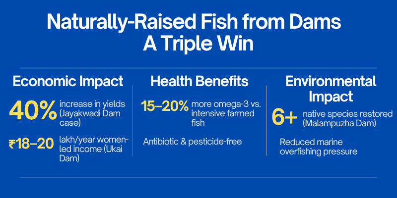 India’s fisheries sector, which contributes 1.24% to national GDP and nearly 7% to agricultural GDP, sustains the livelihoods of over 28 million people. One of the greatest impacts of dam aquaculture is in rural communities. For example, 120 fishermen at Jayakwadi Dam in Maharashtra implemented scientific stocking, which resulted in a 40% increase in harvest in three years. Household incomes rose from ₹7,500 to ₹12,000, and families used their increased earning capacity to invest more in education and health care.